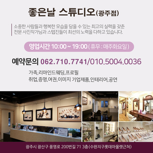 상세설명 우리 가족의 평생 추억을 담을 수 있는 가족사진 부부의 기념일 선물 혹은 부모님의 효도 선물로 추천하는 리마인드웨딩 작은 증명사진도 아무 곳에서나 찍지 마시고 이제 전문 사진스튜디오 좋은날스튜디오에서 인생사진으로 만들어 보세요. 소규모, 대규모 광주가족사진 / 리마인드웨딩 / 광주증명/여권/취업/프로필사진 광주가족사진전문사진관/ 스튜디오